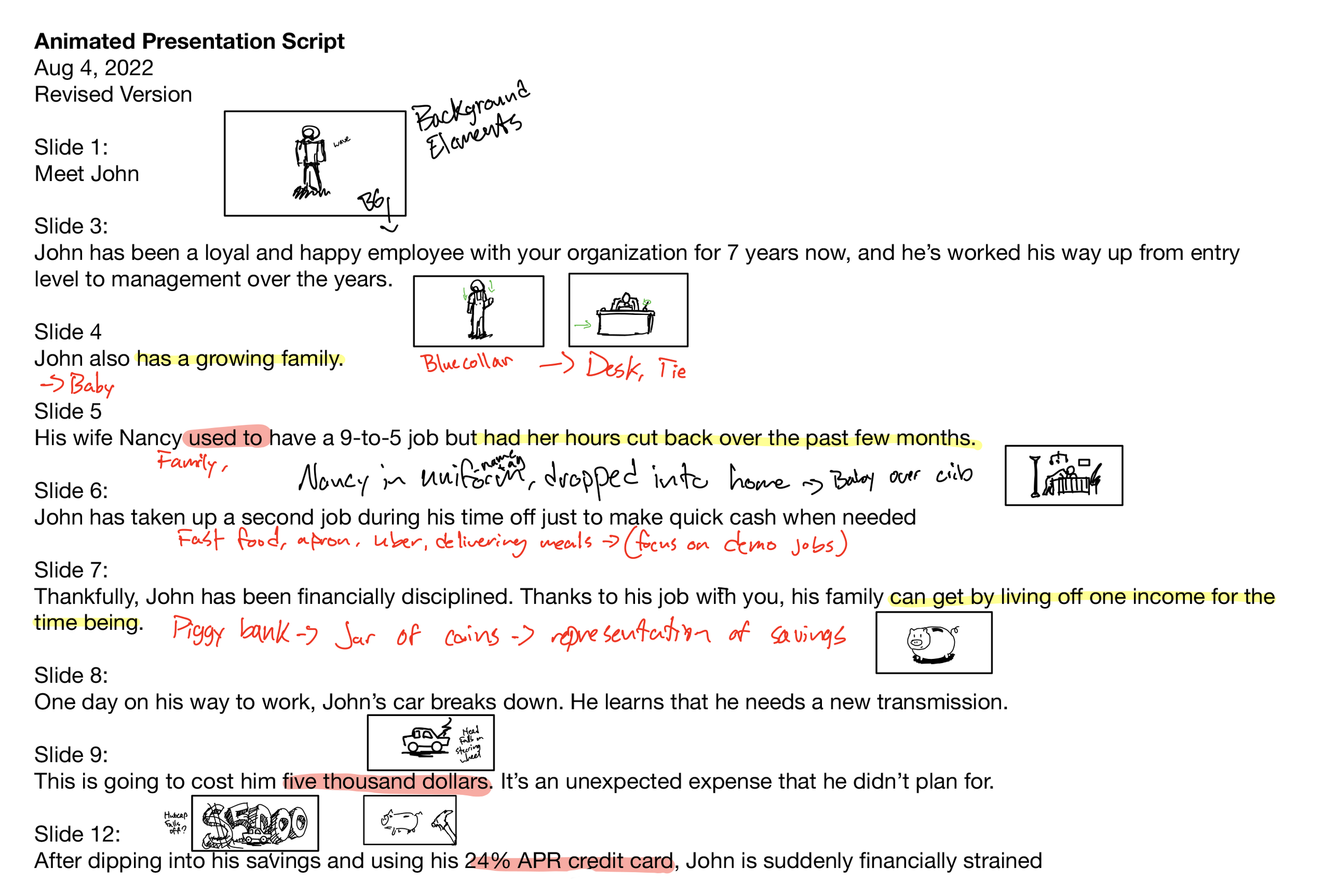 The animation follows a fictional employee named John as he navigates a common financial challenge. The goal was to make the story relatable and easy to follow while visually simplifying financial decisions.